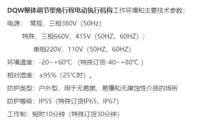 During the operation of the valve, the selection of the output torque of the electric actuator depends on the torque required for opening and closing the valve. This torque value is typically determined by the user or selected by the valve manufacturer based on actual conditions. For the DQW overall regulating type angular position electric actuator, the manufacturer is only responsible for the output torque of the actuator.