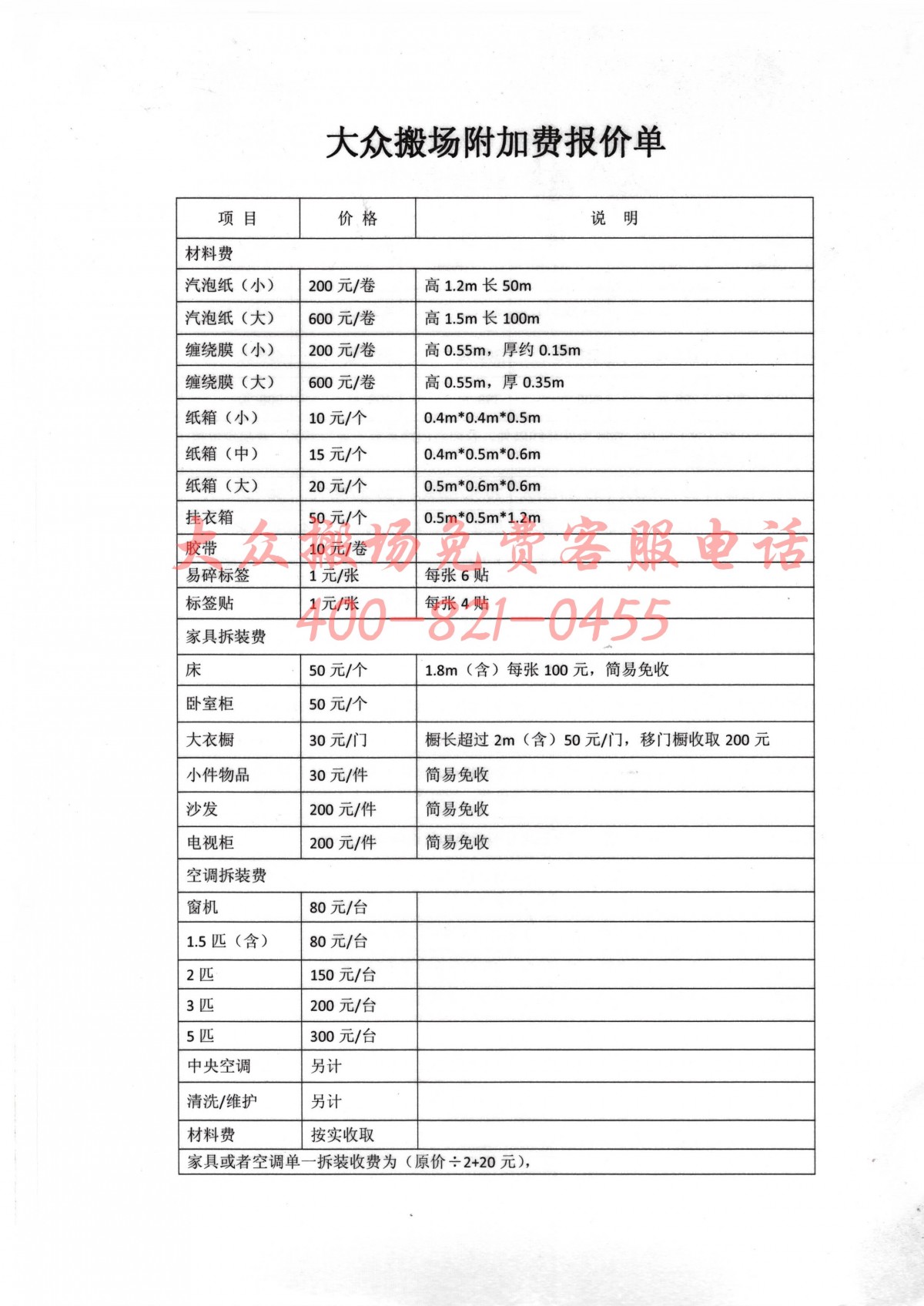 The attached image displays Volkswagen Moving's additional charges rates. Due to the frequent occurrence of special service items during the moving process, please call our customer service at 400-821-0455 for inquiries. We apologize for any inconvenience caused.