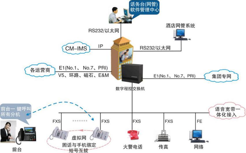 In response to the current state of hotel communication systems, we will offer a modern communication exchange platform with robust voice switching capabilities, featuring no blocking, low maintenance costs, ease of maintenance, and a rich range of functional applications. The platform is also technologically advanced in terms of openness, scalability, and technology. Our fundamental goal is to enable hotels to have a high-level, efficient, and secure office communication environment as modern establishments.