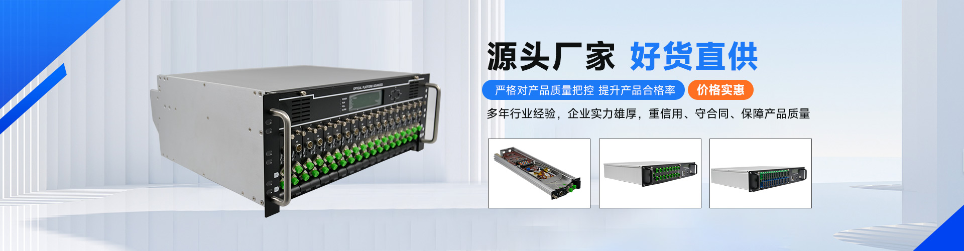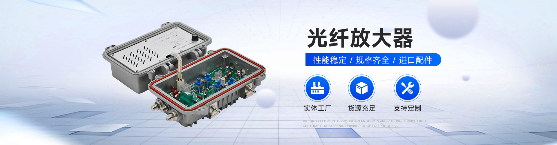公司主要生产产品有155nm外调制光发射机、1310/1550nm直调光发射机、光接收机、1550nm(EDFA)掺铒光纤放大器HFC光传输平台等系列产品。