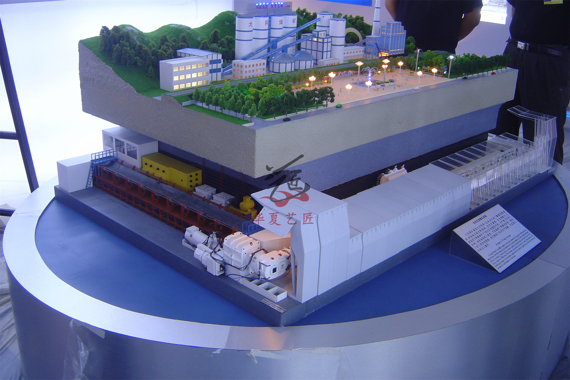 The model is composed of ten parts: the framework main body, the ground industrial plaza and its main building layout system, the underground tunnel layout system, the production system (coal transportation system, auxiliary transportation system, ventilation system, drainage system, power supply system), the solid backfill material conveying system, the slurry backfill system, the comprehensive mining face mining and its equipment layout system, the demonstration system of overlying strata collapse and subsidence process on the solid backfill belt after the goaf, the electrical control system, and the video display system. The solid backfill system includes control plans, equipment matching plans, mixing plans, and weighing plans. It achieves control over the main body of the model framework.