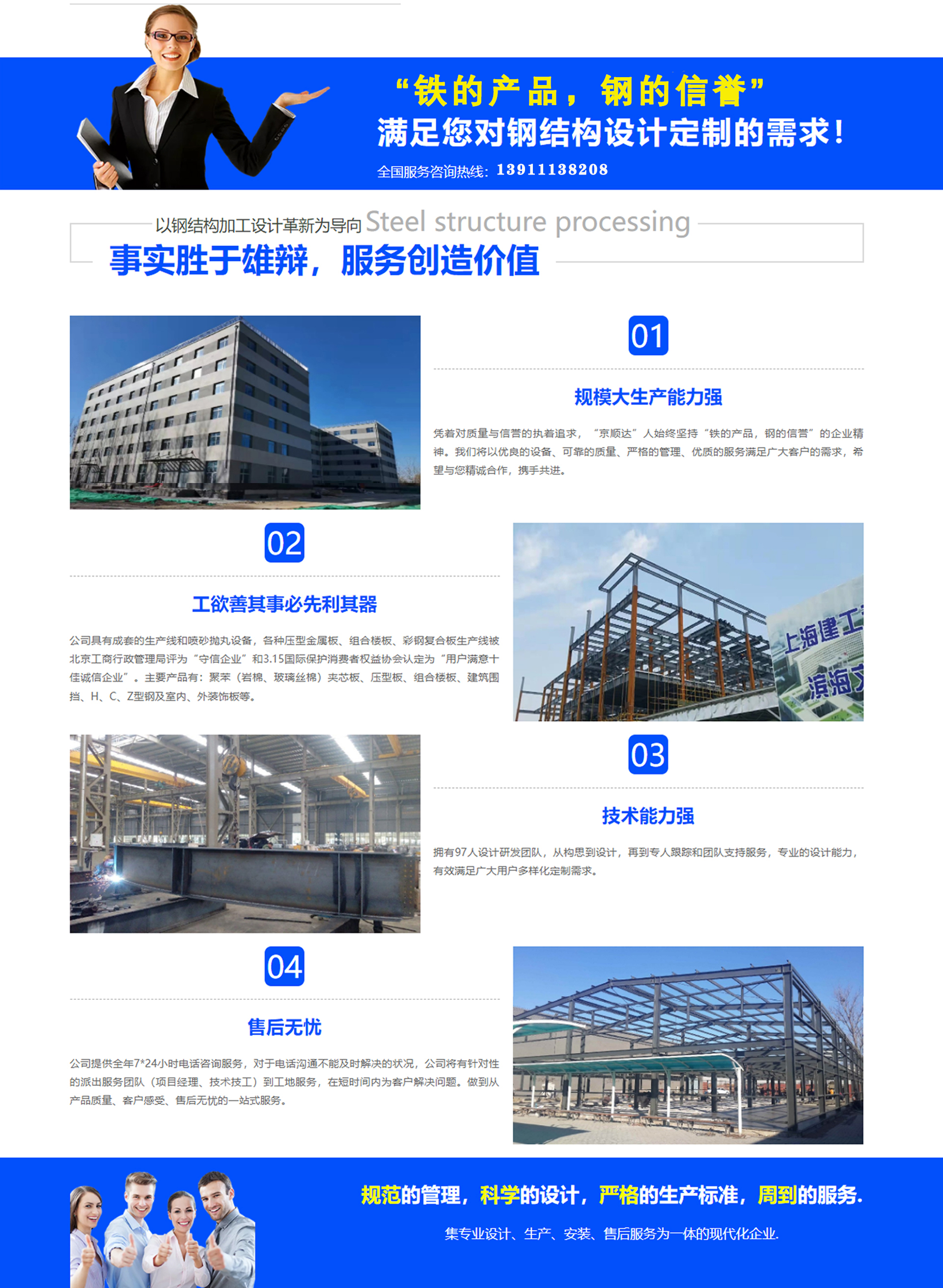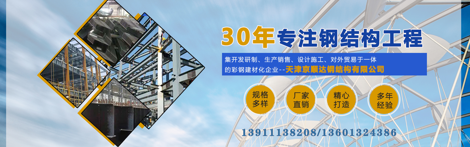 Jing Shun Da Enterprises has been involved in the color steel steel structure construction materials industry since its inception. Relying on the era's demand for color steel and steel structures, and leveraging its own advantages, over three decades of rich experience, and unwavering pursuit of quality and reputation, Jing Shun Da has rapidly risen to become a comprehensive color steel materials enterprise integrating development and research, production and sales, design and construction, and foreign trade. Jing Shun Da Enterprises operates subsidiaries such as Beijing Jing Shun Da Color Steel Steel Structure Engineering, Tianjin Jing Shun Da Steel Structure, Beijing Jing Shun Da Color Steel Products, Beijing Jing Shun Da Color Steel Corrugated Sheets, and Nei Mongol Jing Shun Da Steel Structure Color Plate. With total assets exceeding 100 million yuan, annual export trade over 10 million yuan, and annual sales over 1 billion yuan. The quality of Jing Shun Da's products has reache...