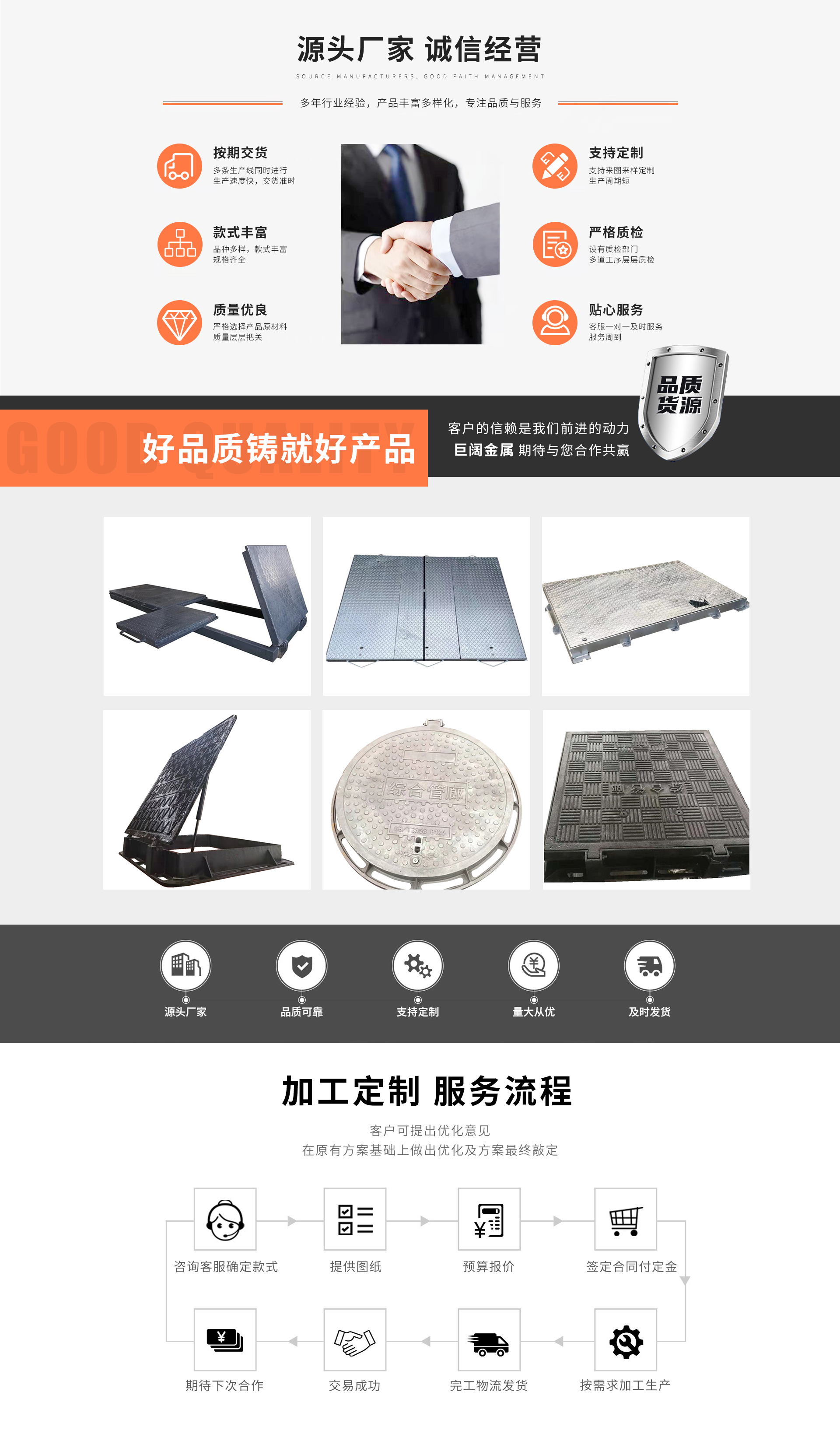 Bozhou Jukuo Metal Products Co., Ltd. was established in 2014 and is an integrated entity specializing in the design, production, and sales of hydraulic manhole covers – remote-controlled hydraulic manhole covers, remote-controlled electronic manhole covers, intelligent escape systems, comprehensive pipeline corridor environmental monitoring systems, and artistic manhole covers. The overall appearance of the manhole covers is available in square and round shapes, and the materials include ductile iron, carbon steel, low-carbon steel, and stainless steel 304, all of which can be cast into a single piece. The advantages of casting into a single piece include the ability to customize the appearance, installation dimensions, and materials of the manhole covers according to customer requirements. The products are widely used in various industries such as urban comprehensive pipeline corridors, telecommunications, electricity, municipal infrastructure, potable water, and gas.The com...