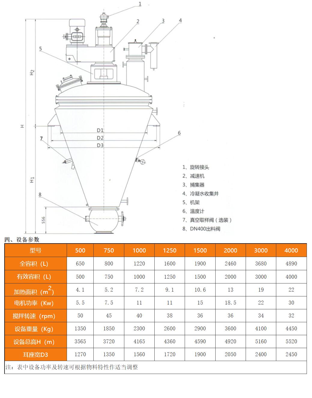 This unit consists of a motor, reducer, frame, mechanical seal, hollow double-screw impeller, conical drum with jacketed heating, and discharge valve, etc.