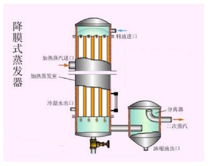 Kadate Evaporation and Crystallization Co., Ltd. produces film蒸发, where the feed liquid is added to the tube box of the film evaporator's heating chamber, distributed evenly through the liquid distribution and film-forming device, and flows uniformly through the heat exchange tubes. Under the action of gravity, vacuum induction, and airflow, it forms a uniform film that flows downward. During this process, the liquid is heated and vaporized by the heating medium in the shell side, and the vapor, along with the liquid phase, enters the separator of the evaporator. The vapor and liquid are then fully separated; the vapor is condensed in the condenser (single-effect operation) or fed into the next evaporator as a heating medium, thereby enabling multi-effect operation. The liquid phase is discharged from the separator. For more information, please call our technical hotline for detailed inquiries.