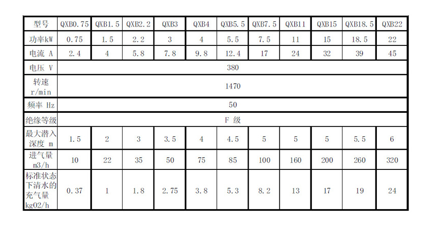 QXB Centrifugal Submersible Aerator Performance Parameters: