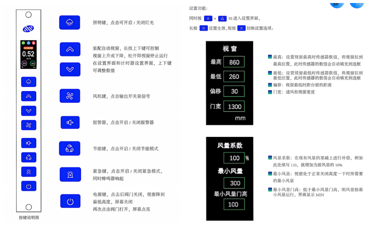 控制器:带液晶显示的集成控制面板,可视化控制各项参数,支持流量型蝶阀或者文丘里阀,系统响应速度快(<1S),稳定性好,支持4G 联网,可以实现通风柜远程监控,支持电动视窗功能,采用视觉区域检测传感器,人静止状态时也能检测到,使用网线接口安装方便,让您的操作省心放心。