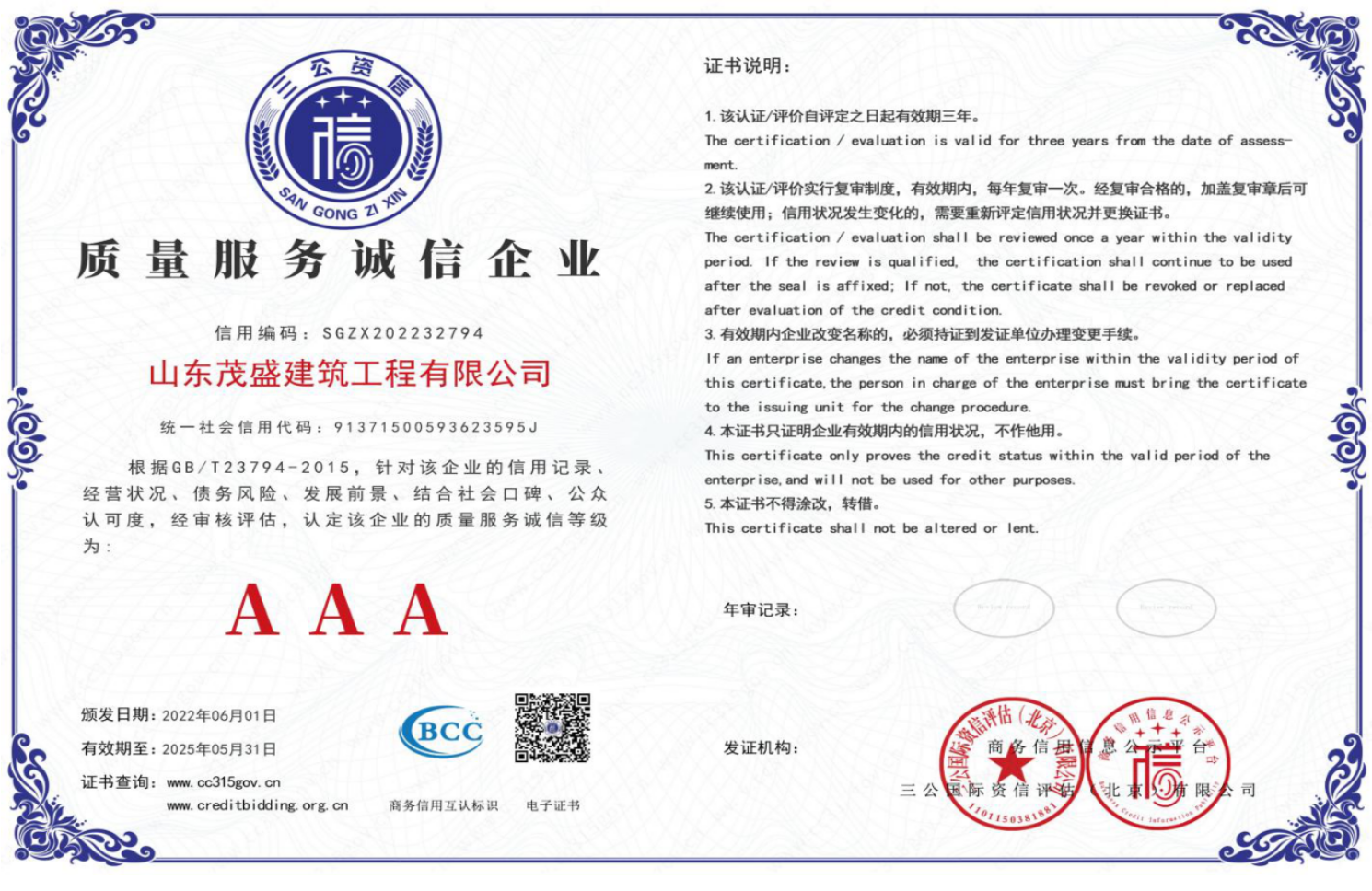 AAA诚信经营示范企业_荣誉资质_山东茂盛建筑工程有限公司