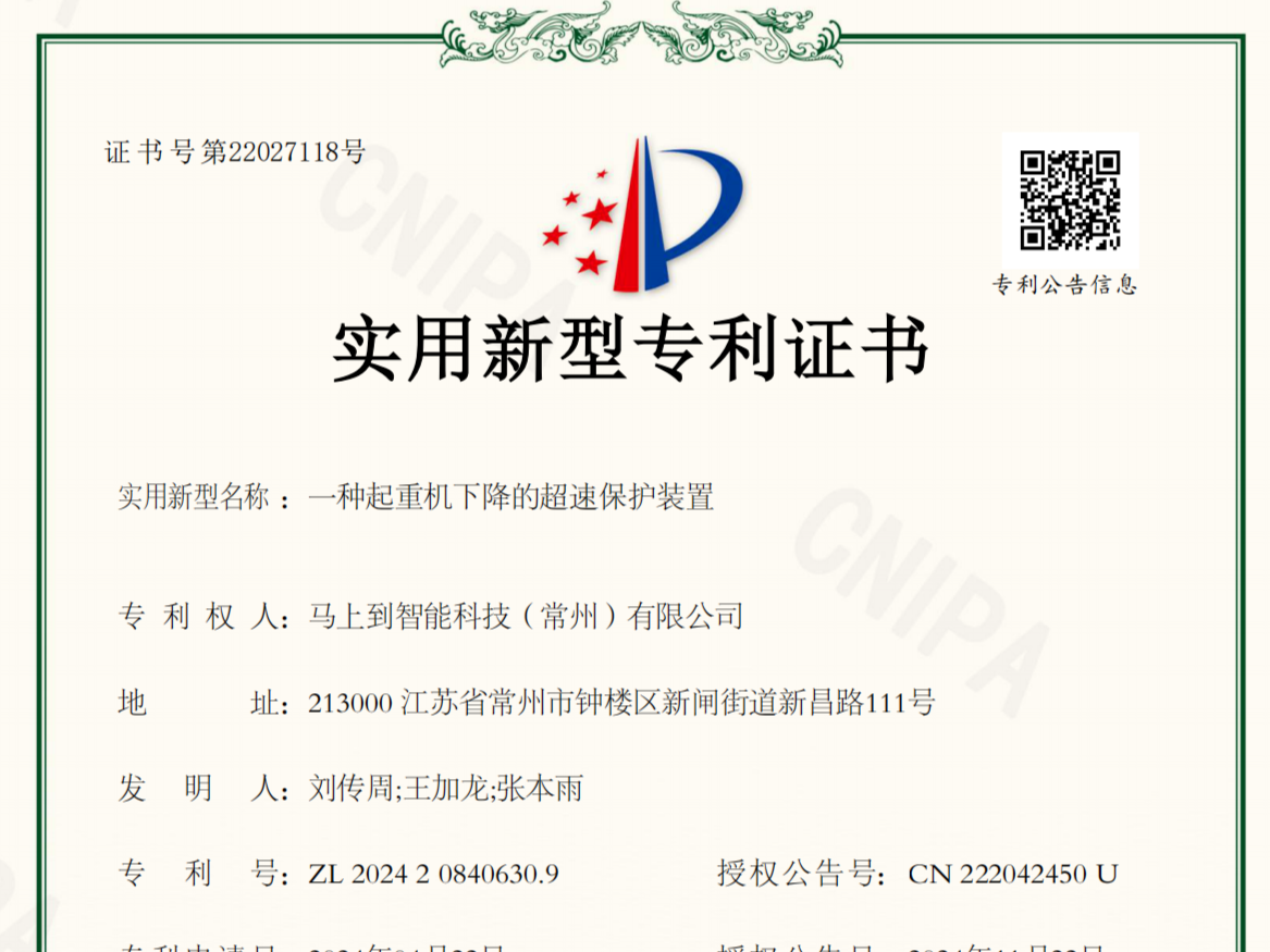 In modern industry, safety is always one of the top considerations. To further enhance the safety of crane operations, Intelligent Technology (Changzhou) Co., Ltd. has recently developed an overspeed protection device for crane descent, which has been granted a utility model patent certificate by...