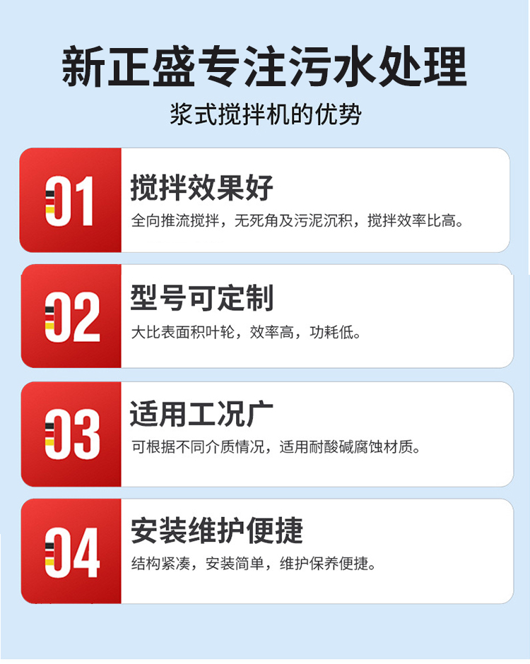The mixer blades are designed with a 45-degree bent blade for optimal axial, radial, and tangential分流, ensuring rapid and thorough mixing of materials with water, meeting process requirements.