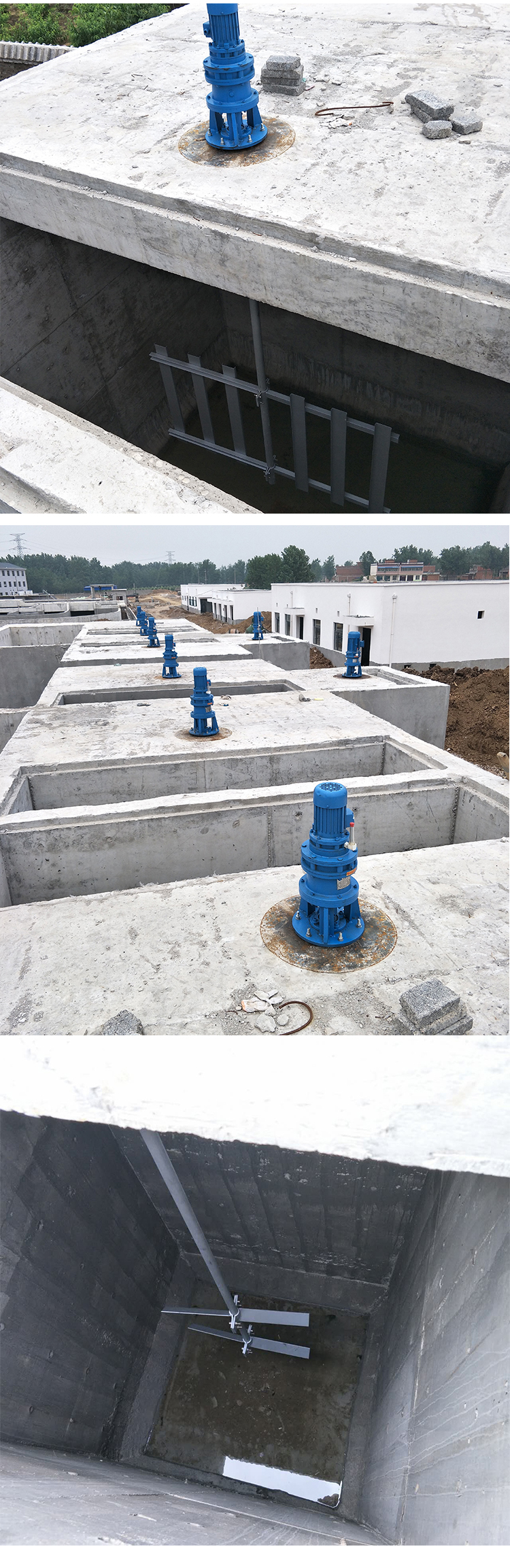 4) For propeller mixers with underwater pedestals: After securely fastening the underwater pedestal to the connecting base, place it horizontally on the corresponding position of the prefabricated concrete components at the bottom of the pool. Check and adjust the pedestal's plane to ensure it is level, with the center position aligned with the center of the reducer's pedestal's centroid.