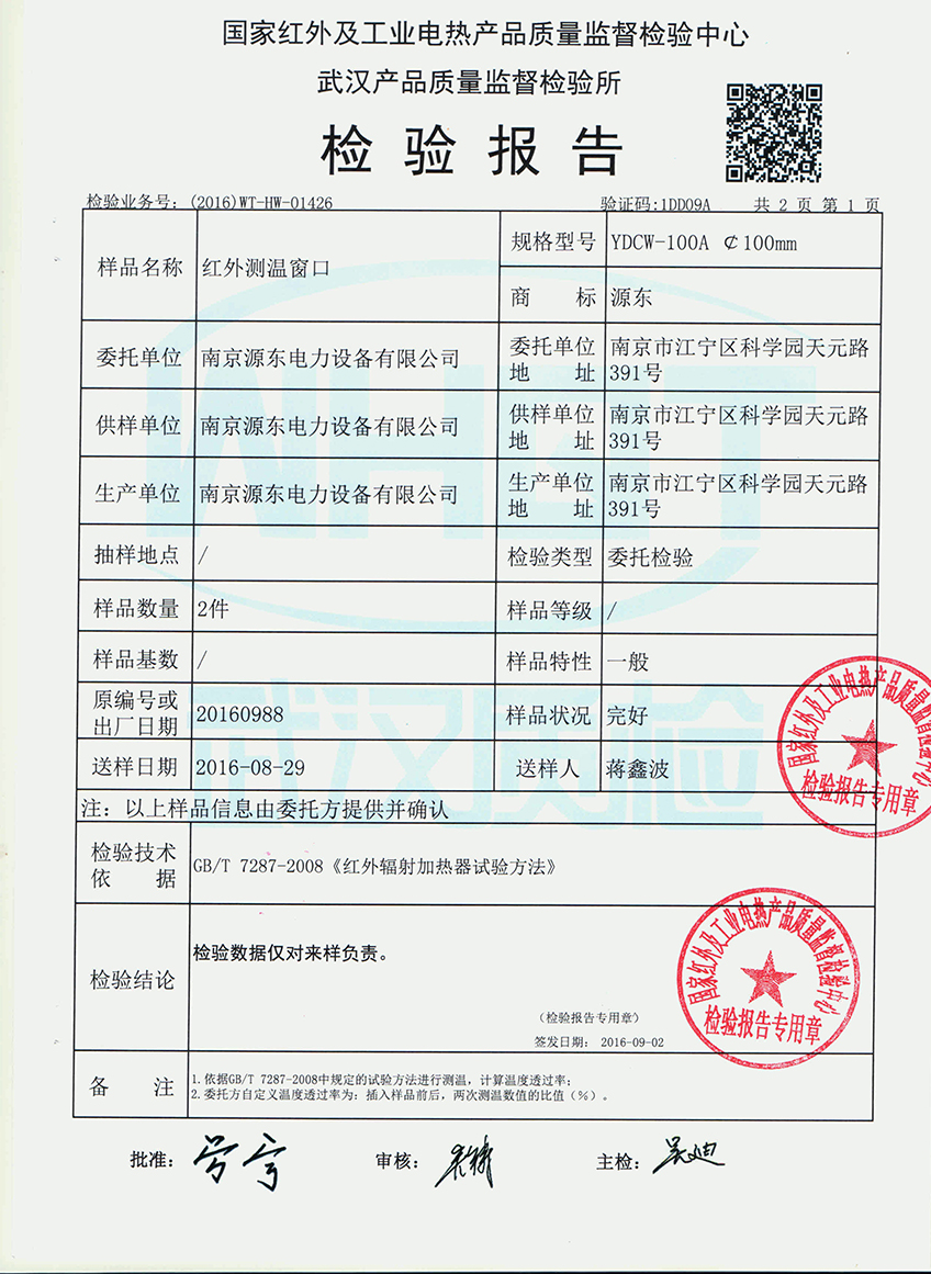 | 发证机构: | 国家红外及工业电蒸产品质量监督检验中心 | 发证时间: | 2016-09-02 |