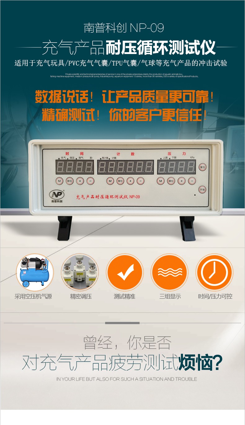 1. Utilizes timing, counting, and pressure systems for pressure cycle testing of inflatable products. 2. Time: inflation time, pressure retention time, exhaust time; system control for inflation activities; 3. Pressure: set upper and lower pressure limits; stop testing upon exceeding limits; 4. Counting: record of test cycles, which can be set.