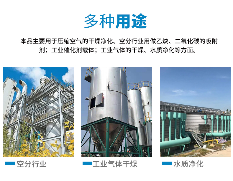 Air separation water-resistant silicone is mainly used as a drying agent in the air separation process, for adsorption in the preparation of liquid air and liquid oxygen, drying of compressed air and various industrial gases. It serves as a liquid adsorbent and catalyst carrier in the petrochemical, electrical, brewing industries, and is used for water quality purification in water treatment.