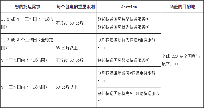 ** 提供的服务可能有所改变。如需获悉详情,敬请联系所在当地的客户服务团队。 #有关多个包裹合并在一个货件中,待递送给位于同一个目的地国家/地区但不同地点的多个收件人的托运解决方案。 +请致电客户服务热线预定舱位。 ^如需托运300公斤或以上货件请致电客户服务热线预定舱位。