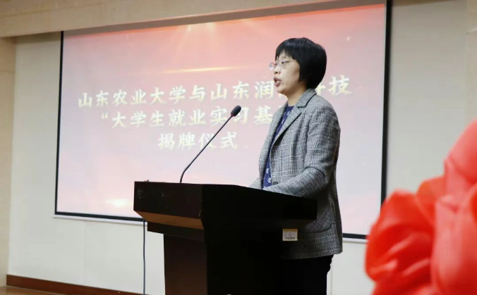 Shandong Agricultural University's College of Agriculture Party Committee Secretary Wang Qun and Shandong Runhao Water Conservancy Technology Chairman Tao Anxue unveil the signboard for the University Student Employment and Internship Base.