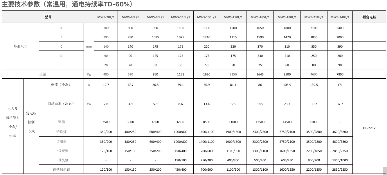 Utilizing alternative magnetic circuit design, with a high air gap magnetic density. The coils are made of aluminum wire, and the coil protective plate is made of abrasion-resistant and shock-resistant rolled high manganese steel plate. It features light weight, low energy consumption, high lifting capacity, and a long service life.