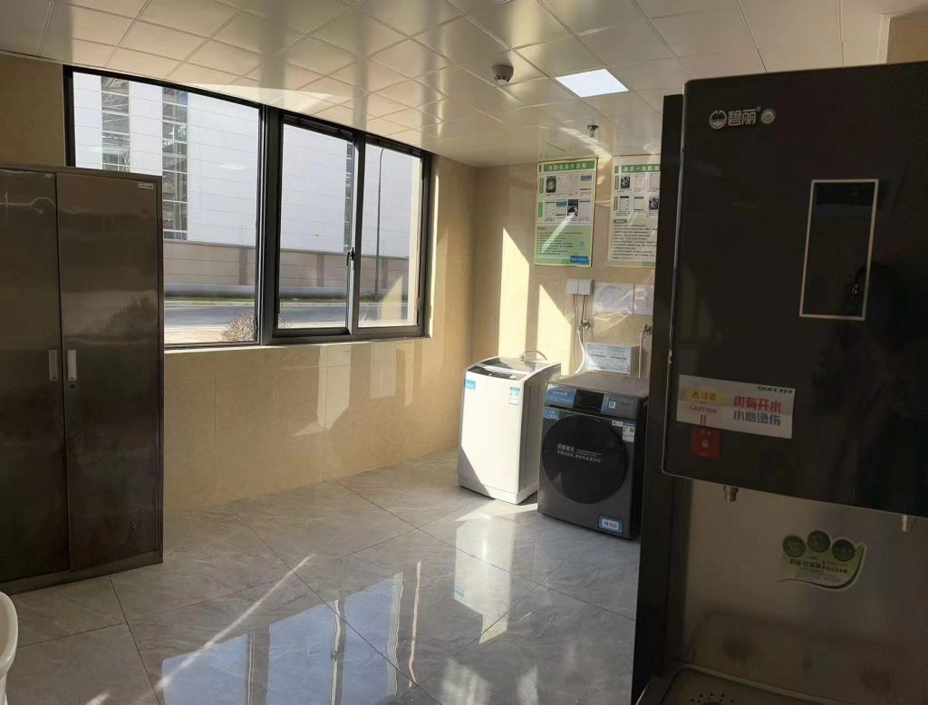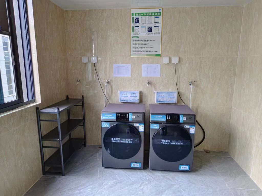 我们为常州移远通信技术有限公司职工宿舍的用户提供具备多种功能的洗烘一体式洗衣机,搭配洗衣液、消毒液自动添加装饰,方便员工使用,每间洗衣房提供置物架,墙上操作流程说明及消毒巡检表张贴清楚,每台洗衣机安装漏电保护装置,保证用电安全。