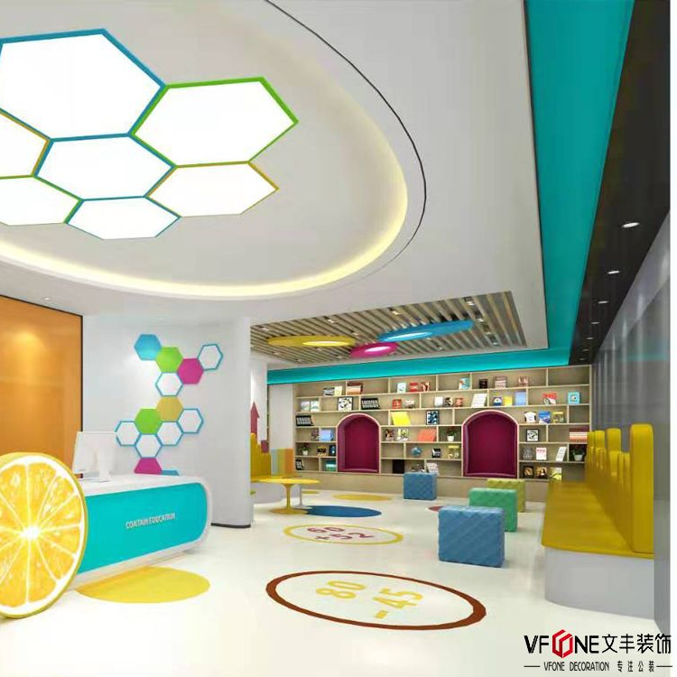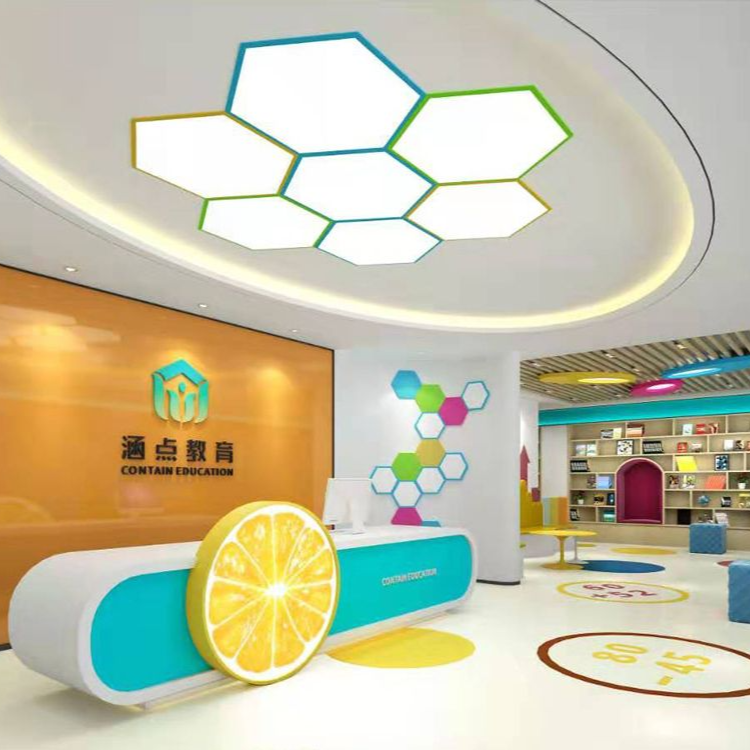 The front desk represents the facade of a training institution, and during design, our company pays special attention to it. In this case, a striking orange image wall is used as the background, with the institution's logo integrated; the large lemon pattern at the front desk serves as an accent, leaving a lasting impression. In terms of lighting design, to prevent light pollution, the designer avoids glare, as it can strain children's vision and affect the development of their visual nerves.