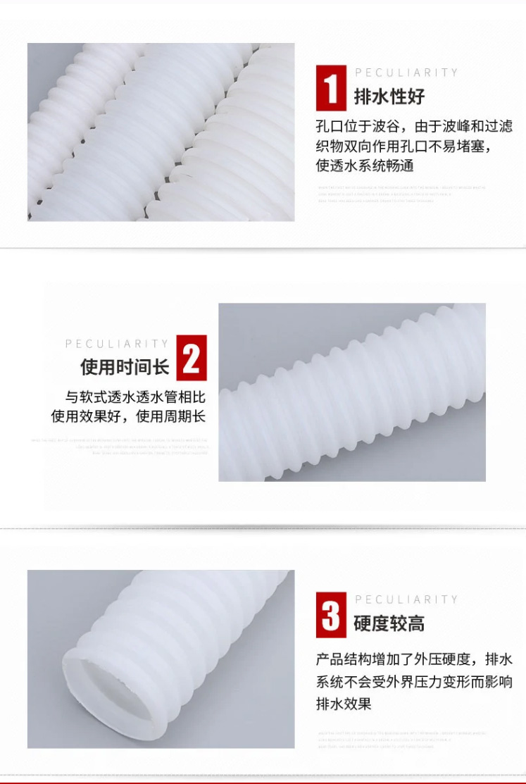 HDPE corrugated pipe, commonly known as PE corrugated pipe, includes single-wall corrugated pipe, double-wall corrugated pipe, single-wall perforated corrugated pipe, and double-wall perforated corrugated pipe. First successfully developed in Germany in the early 1980s. After more than a decade of development and refinement, it has evolved from a single type to a complete product series. The production process and application technology are highly mature. Due to its excellent performance and relatively cost-effective pricing, it has been extensively promoted and applied in developed countries like Europe and the United States.