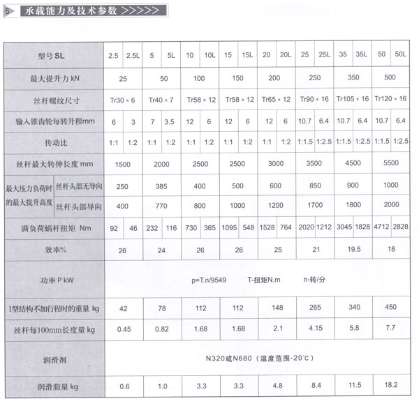SL齿轮螺旋升降机的承载及技术参数:
