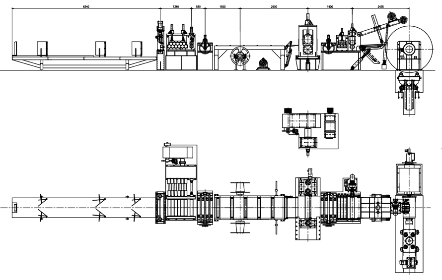From right to left: feeding trolley + hydraulic uncoiler ---- uncoiler gripper + left-right guiding position ---- longitudinal shearing machine ---- edge slitting machine ---- left-right guiding position 2 ---- leveling machine + hydraulic cutter ---- material receiving table
