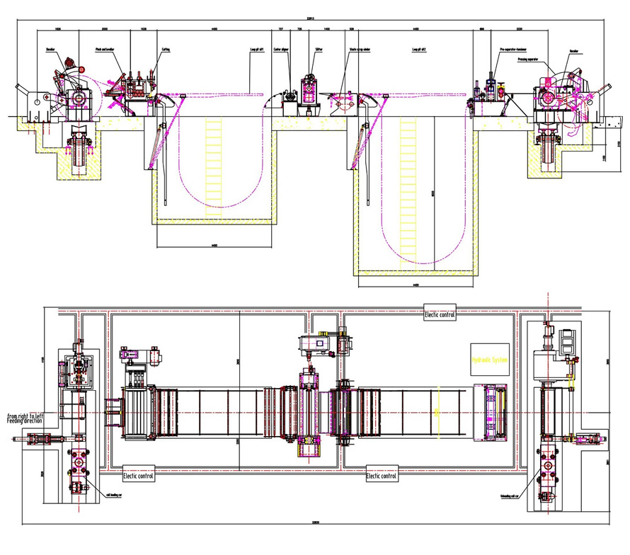 From left to right: Material feeding cart + hydraulic uncoiler ------ Uncoiling clamp + trim剪切 ----活套1 ---- Left and right guide positions ---- Longitudinal slitting machine + edge wire machine ------活套2 ------ Tension station ------ Rewinding machine + material unloading cart