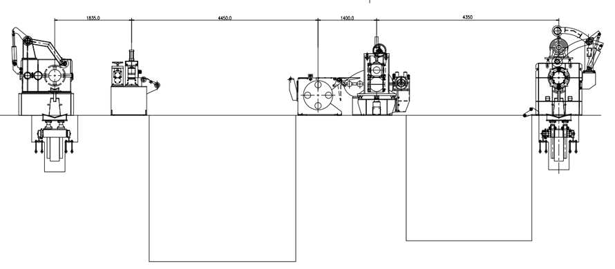 From right to left: material feeding trolley + hydraulic uncoiler --- left and right guide positions --- longitudinal cutting main unit --- edge thread machine --- tension station --- winding machine + unloading trolley