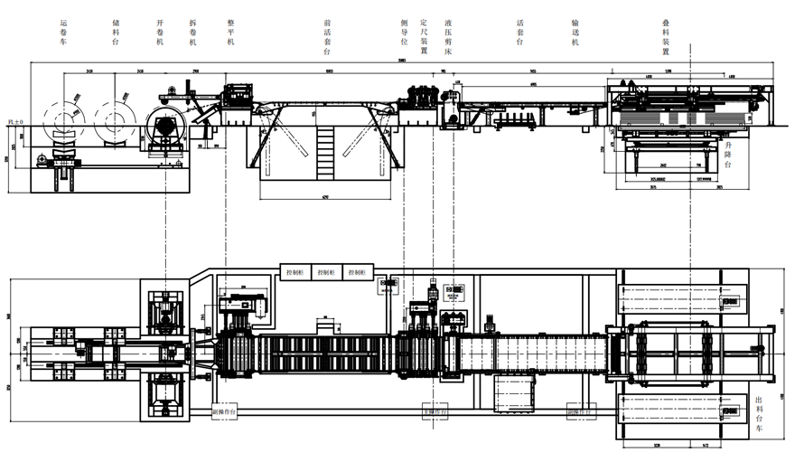 This production line is primarily composed of material feeding trolleys, double-top uncoiling machines, hydraulic bucket head pressing and pulling mechanisms, initial straightening machines, fine straightening machines, shearing machines, material stacking racks, matching electrical control systems, and hydraulic systems. Additionally, swing-type intermediate plates and deviation correction devices are provided between the machines.