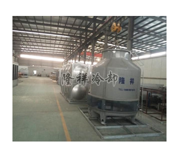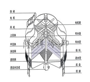 Hot water is evenly distributed over the film by a rotating sprinkler system, then dried air is drawn from the bottom by a top axial-flow fan, causing the hot water to evaporate and cool down. The cooled water is collected in the base and recirculated back to the heat source via a pump.