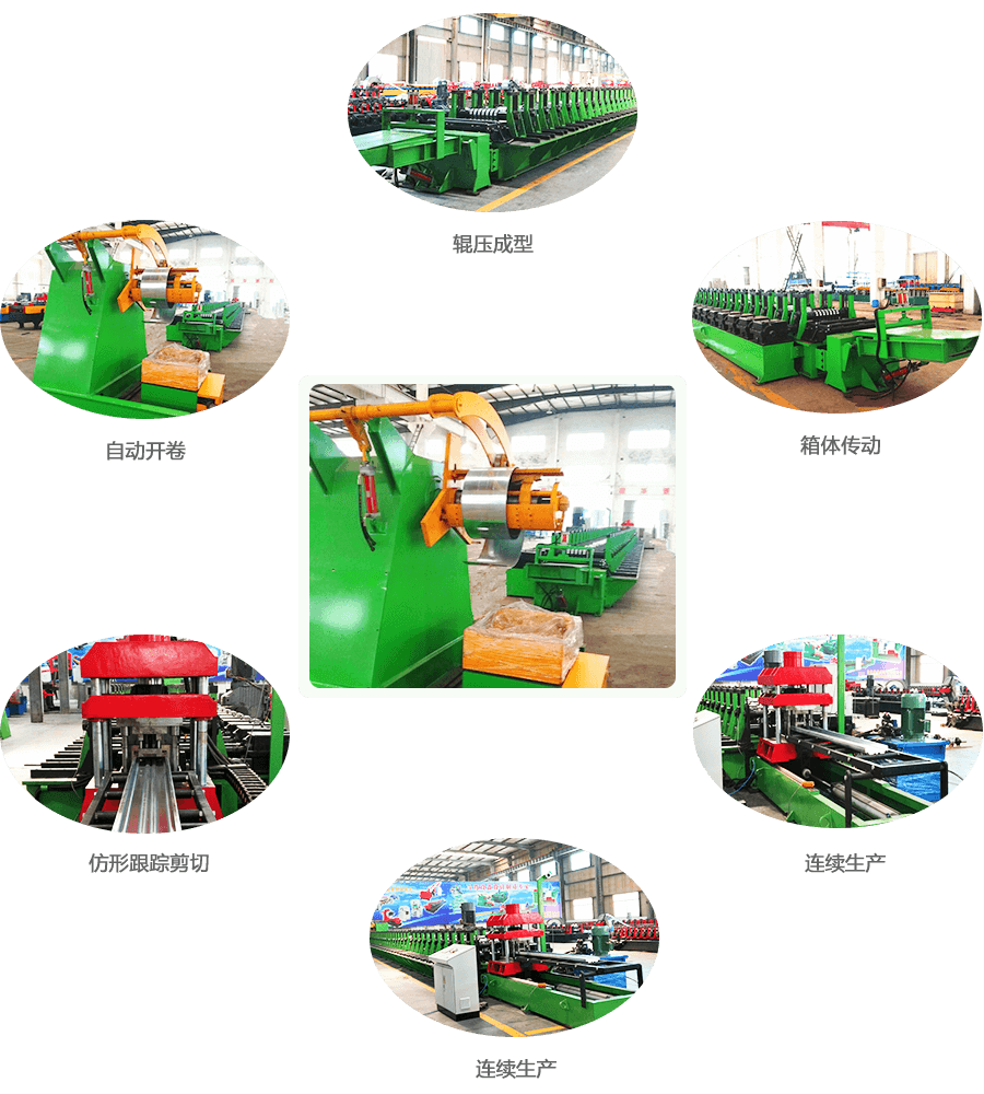 Hydraulic Auto-Coiler → Guiding Device → Leveling → Roll-Forming → Mechanical Tracking Punching and Cutting → Material Support and Sheet Exiting