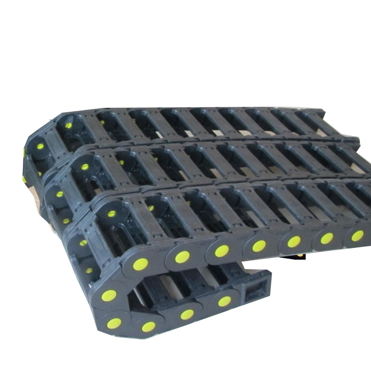 (3) Each link consists of left and right chain plates, as well as top and bottom covers. Each section of the drag chain can be opened easily for assembly and disassembly, without the need for wiring. After lifting the cover, cables, oil pipes, gas pipes, water pipes, and other items can be placed into the drag chain.
