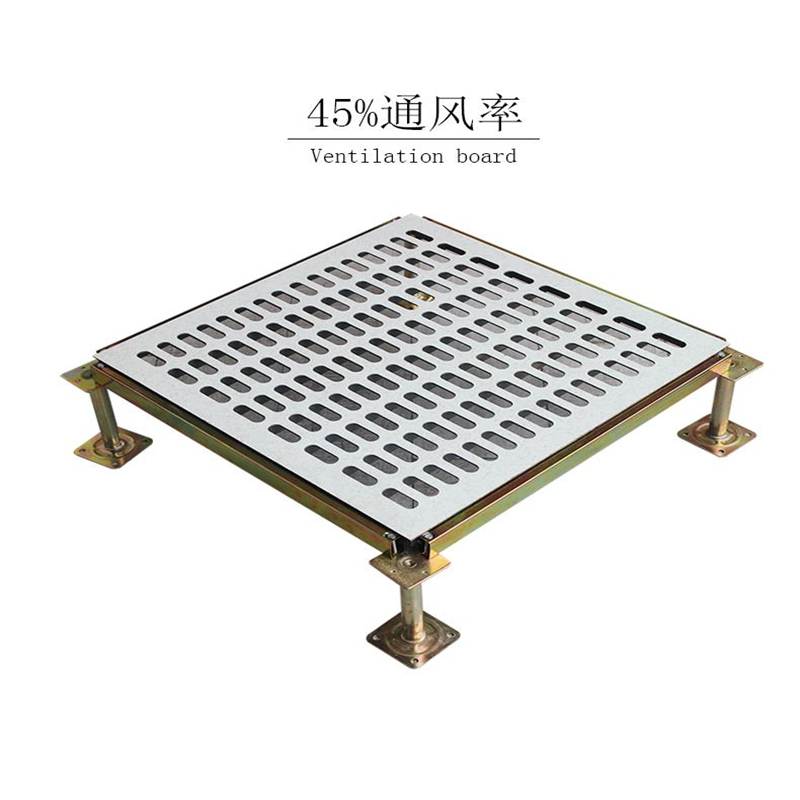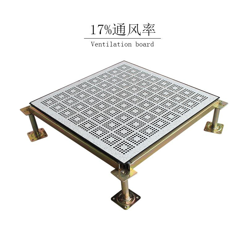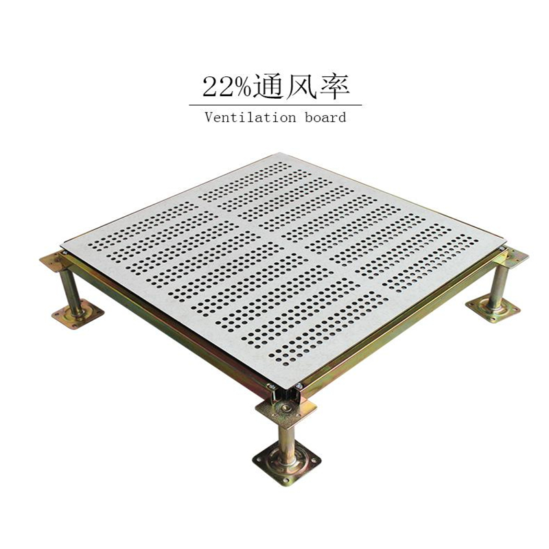 The ventilation floor panel is structurally similar to the anti-static floor panel, with the same top and bottom surfaces, but the interior cavity of the ventilation floor is empty and unfilled with foam concrete. The upper and lower steel plates of the ventilation floor, as well as the upper surface material, are punched with ventilation holes. The ventilation floor is used in conjunction with the anti-static floor, where ventilation is required beneath the floor. The ventilation rate of the ventilation floor ranges from 17% to 55%.