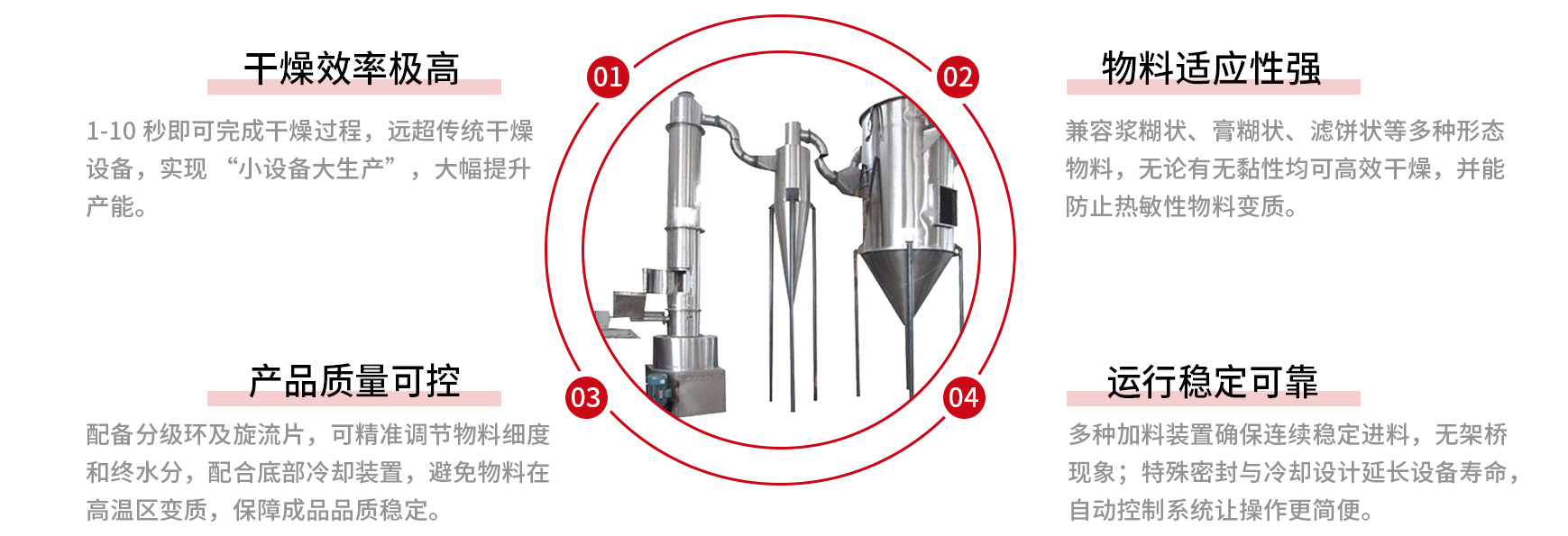 旋转闪蒸干燥机是气流干燥机与流化床相结合的新型干燥机,物料和气流在旋转状态下闪电般的蒸发水分,1-10 秒内就可以完成整个干燥过程。对浆糊状、膏糊状、滤饼状的物料、有无黏性料均可干燥。广泛应用于无机盐类、有机物、陶瓷、染料、食品等领域。