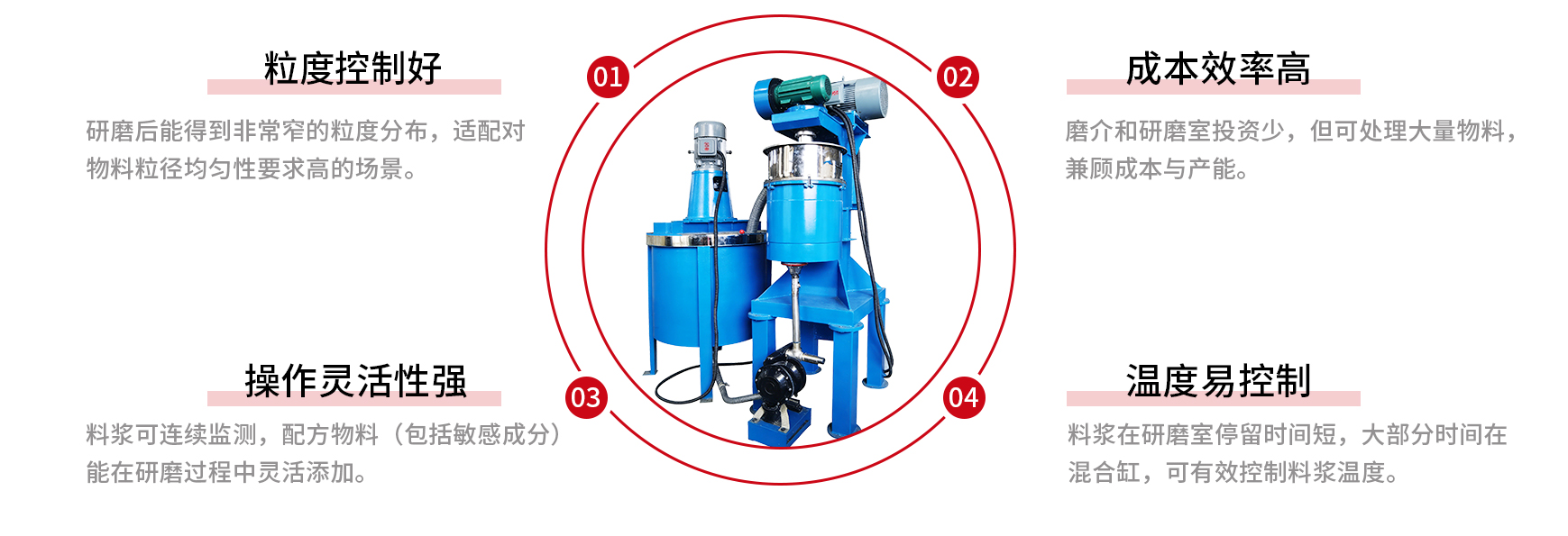 A circular stirrer mill is a type that combines the mixing mill with a mixing tank, commonly used for grinding materials that require a final particle size reaching the micron level, with high quality standards and are difficult to grind and disperse. The feature of this unit is that it can achieve an extremely narrow particle size distribution after grinding.
