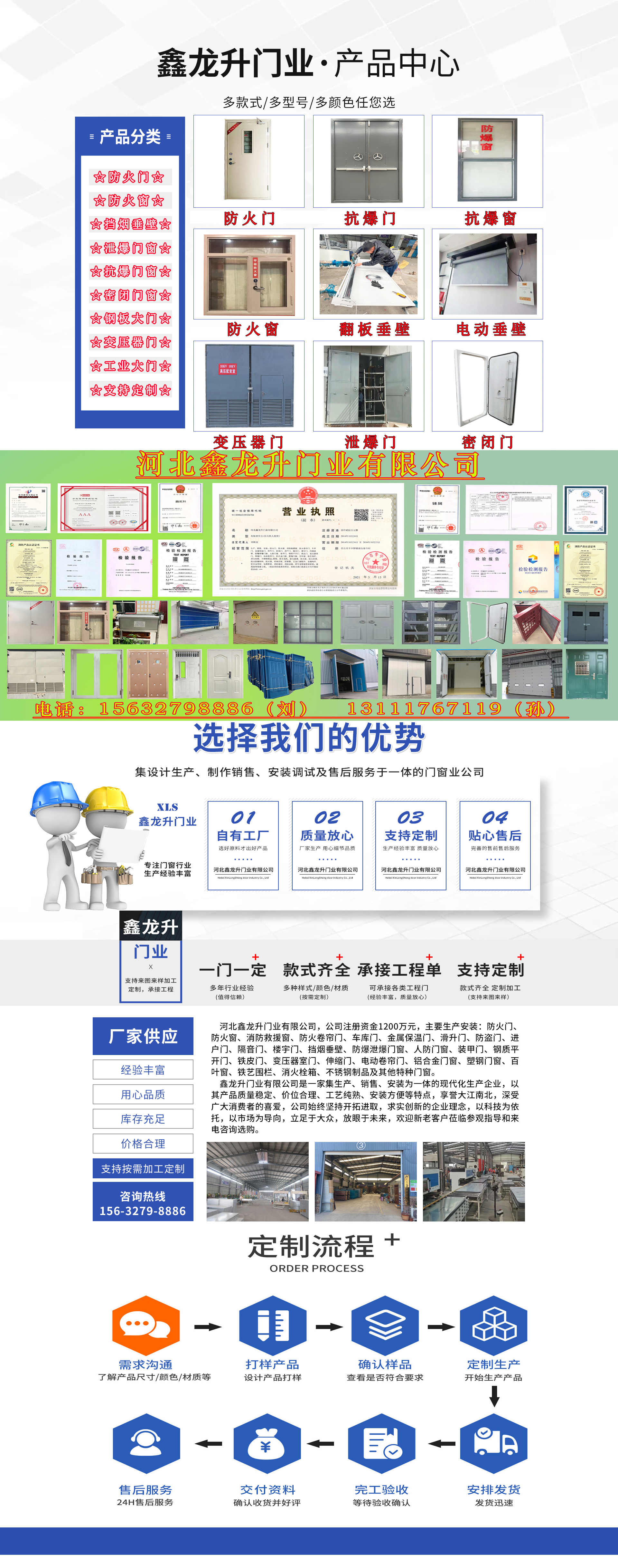 Hebei Xinlongsheng Door Industry Co., Ltd., registered capital of 12 million yuan, specializes in the production and installation of fire doors, fire-resistant windows, emergency rescue windows, fire shutter doors, garage doors, metal thermal insulation doors, sliding doors, security doors, entrance doors, soundproof doors, building doors, smoke barrier curtains, explosion-proof and explosion-relieving windows and doors, civil air defense windows and doors, armored doors, steel flat doors, iron plate doors, transformer room doors, telescopic doors, electric roller shutters, aluminum alloy windows and doors, plastic steel windows and doors, louvers, ironwork fences, fire hydrant boxes, stainless steel products, and other special doors and windows.Our fire-resistant windows and doors meet the relevant specifications and standards. We are capable of undertaking the production and installation of special doors and windows for residential and commercial buildings, as well as fire-resista...
