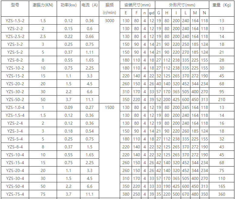 YZS系列振动电机相关技术参数: