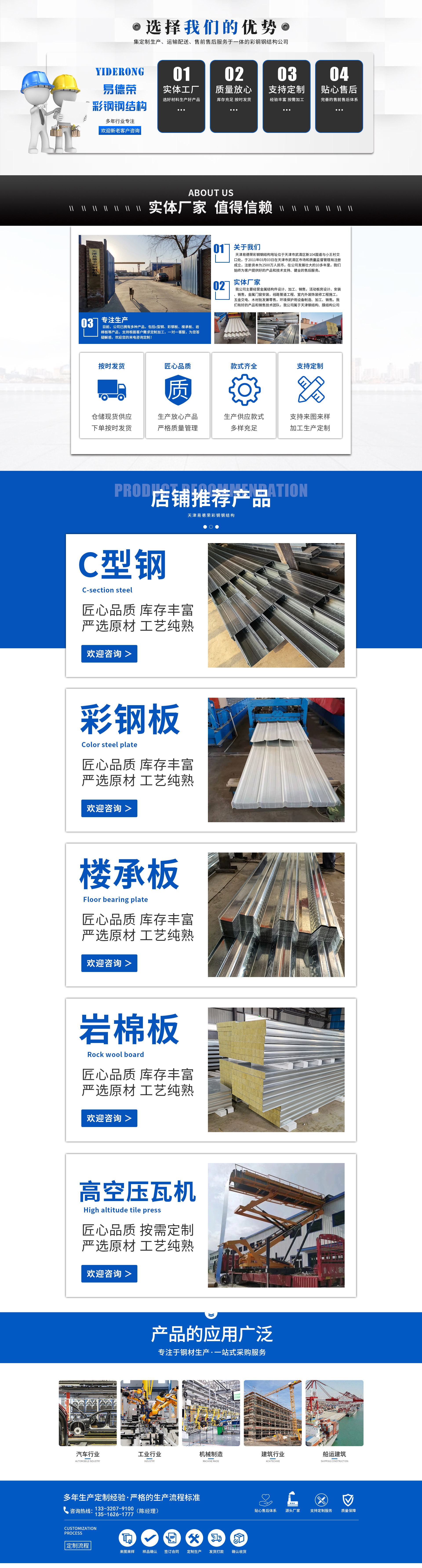 Tianjin Yide Rong Color Steel Structural Engineering Co., Ltd. is located at the intersection of New 104 National Highway and Xiaowang Village in Wuqing District, Tianjin. The company was registered on March 3, 2011, with the Wuqing District Market and Quality Supervision Administration Bureau, and has a registered capital of 25 million RMB. Over more than a decade of growth, we have consistently provided excellent products, technical support, and comprehensive after-sales service. Our main business includes the design, processing, and sales of metal structural components, prefabricated buildings, and metal doors and windows installation. We also undertake the construction of pipeline engineering, indoor and outdoor decoration and renovation projects, as well as wholesale and retail of hardware, electrical appliances, and timber. In addition, we manufacture, process, and sell equipment for environmental protection. We have a skilled product and sales team. Our company belongs to the...