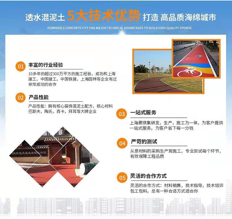 1. Thickness of permeable concrete pavements: As can be seen, the strength of colored permeable concrete is predominantly used in locations such as sidewalks, squares, parking lots, and garden paths. The panel thickness varies according to the different pavement applications. For light-load surfaces like sidewalks and bike lanes, the surface layer thickness should not be less than 8 cm; for medium-load surfaces like parking lots and squares, the surface layer thickness should not be less than 10 cm. To consider costs, the surface layer can be divided into two layers: the top layer is a colored permeable concrete layer, generally not less than 3 cm thick, and the bottom layer is a plain permeable concrete layer.