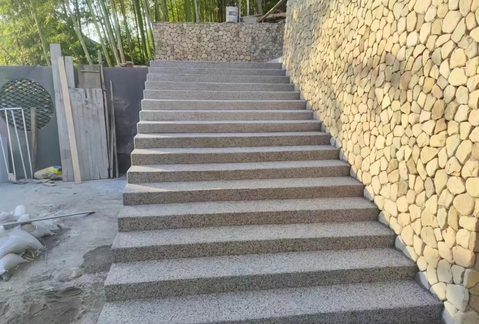 Water-washed stone is a construction technique that has gained increasing popularity in recent years. In essence, it is quite similar to the water-washed stone technique of the 1960s. While the wall construction is more challenging, the quality is easy to maintain. For ground construction, the difficulty is not great, but cracks and localized subsidence are highly likely. Therefore, the foundation design and construction must ensure the stability of the subsoil, and it may be necessary to use reinforced concrete foundation pads. Additionally, it is generally recommended to set settlement joints at intervals of 5 to 6 meters.