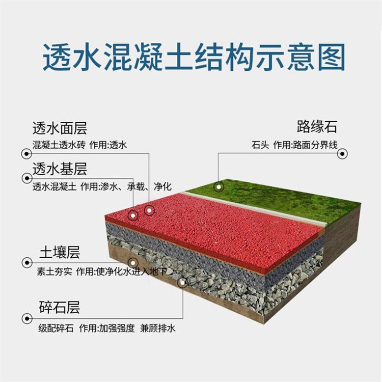 1. Thickness of permeable concrete pavements: As can be seen, the strength of colored permeable concrete is predominantly used in walkways, squares, parking lots, and garden paths. The panel thickness varies depending on the pavement application. For light-load surfaces like walkways and bike lanes, the surface layer thickness should be no less than 8 cm. For medium-load surfaces like parking lots and squares, the surface layer thickness should be no less than 10 cm. To consider cost, the surface layer can be divided into two layers: the top layer being a colored permeable concrete layer with a thickness of no less than 3 cm, and the bottom layer being a plain permeable concrete layer.