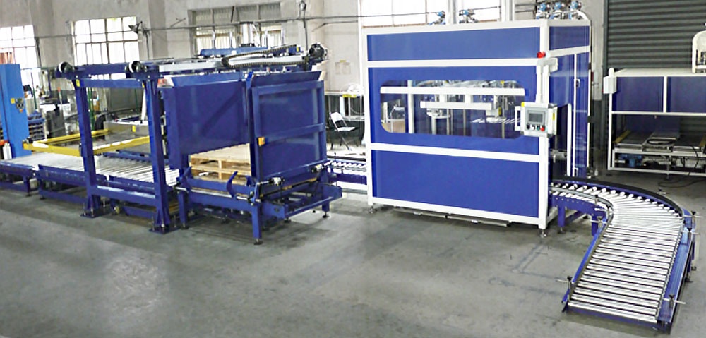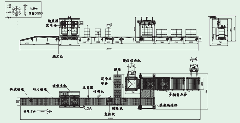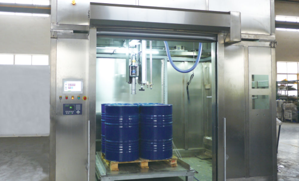 Large Sealed Waterproof Cap (can be stored for re-inspection) — Heavy Drum Automatic Conveying — Automatic Re-inspection Alarm — Coding and Labeling — Automatic Palletizing Machine (with Automatic Pallet Storage) — Forklift Retrieval of Drums (or automatic return to automated storage)
