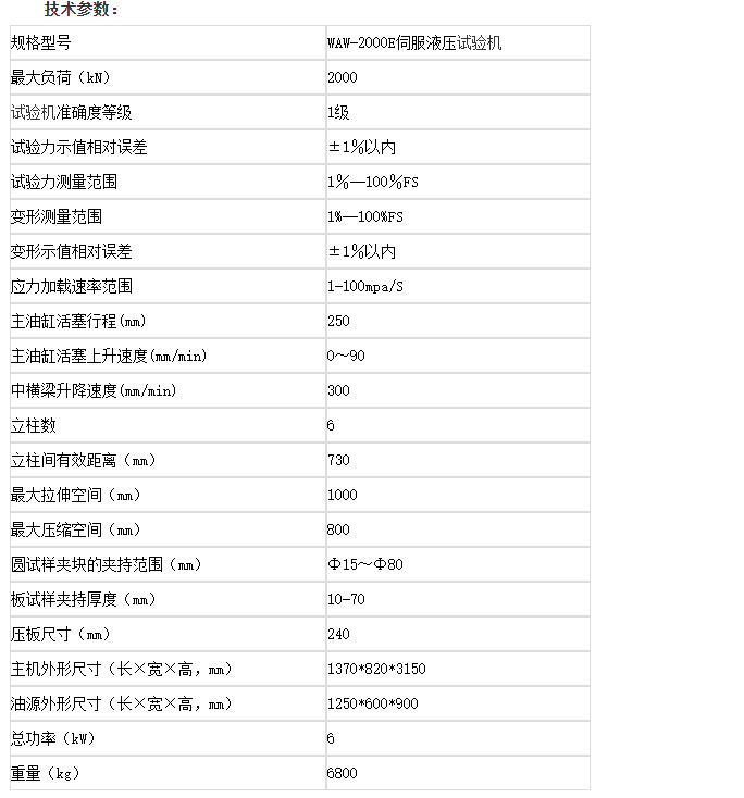 WAW-2000E Servo Hydraulic Test MachineUtilizing a double-space structure with the oil cylinder positioned below, the upper and middle beams form the stretching space, primarily for tensile testing of the sample. The worktable and middle beam create the compression space, enabling compression, bending, and shearing tests on the sample. Both the stretching and compression spaces can be automatically adjusted by rotating the lead screw to move the middle beam up and down.
