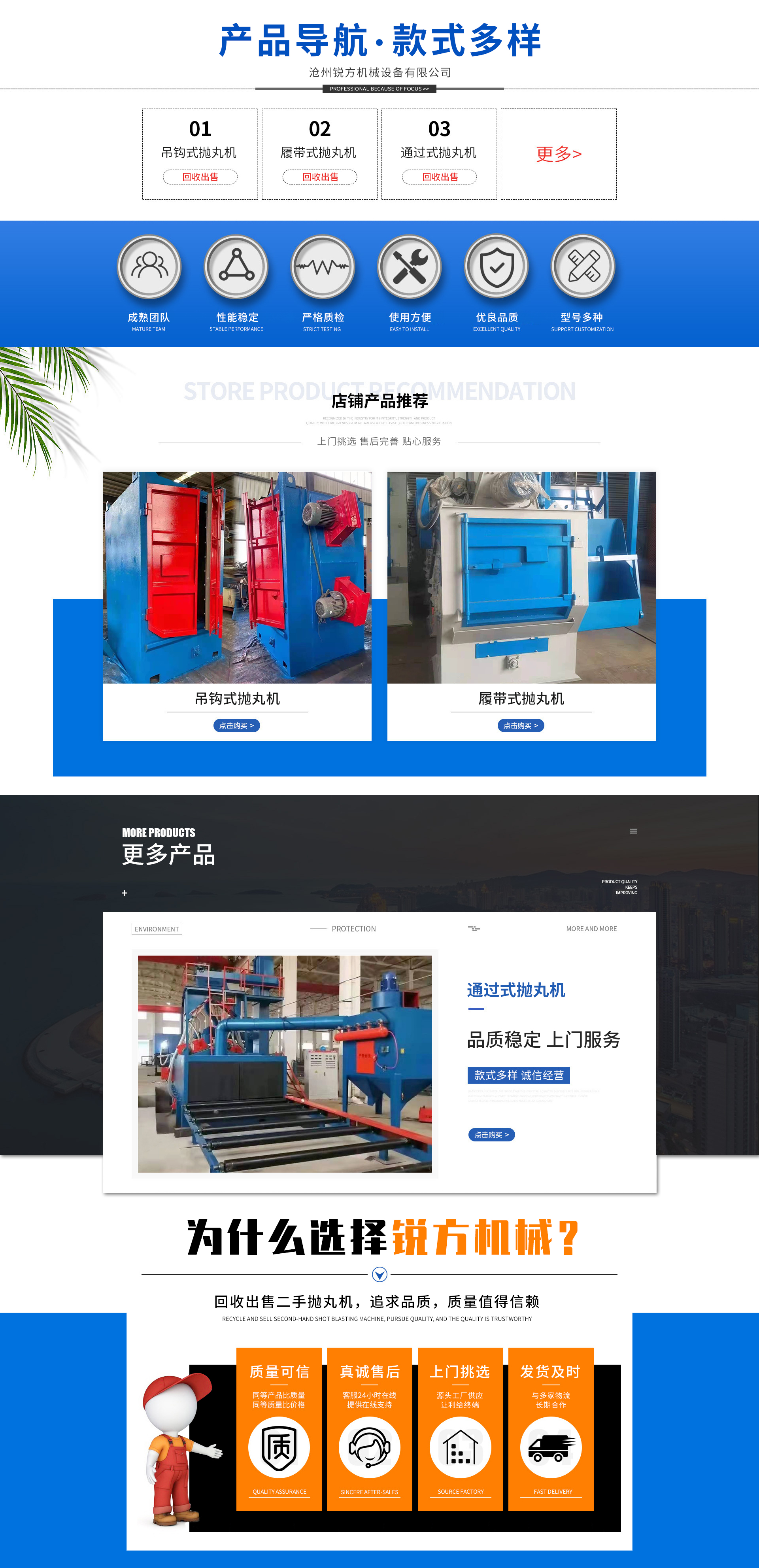 Cangzhou Ruifang Machinery Equipment Co., Ltd. is located in the beautiful city of Cangzhou, Hebei Province. It is an integrated shot blasting machine enterprise that offers recycling and sales services. The company operates under a strict management model, boasts an excellent team of employees, including several engineers, and has a strong research foundation, experimental facilities, and production base.The company's main products include general-purpose shot blasting machines: suspended hook shot blasting machines, crawler shot blasting machines, through-type shot blasting machines, etc.Our company is committed to "Integrity as the foundation, customers as the priority," adhering to the business philosophy of "surviving through quality, developing through innovation, and seeking benefits through management." We are dedicated to collaborating with you through our technology, products, and services!