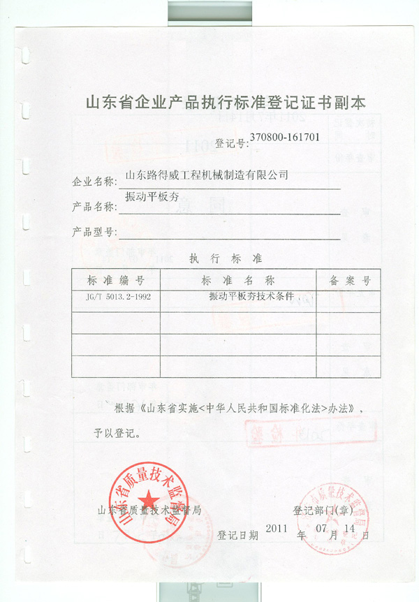 产品标准登记证书