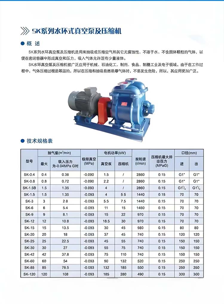 SK Series Water Ring Vacuum Pumps and Compressors SK Series Product Introduction The SK series of water ring vacuum pumps and compressors are designed for suction and compression of air and other non-corrosive, water-insoluble gases without solid particles, to create vacuum and pressure in closed containers. The intake of gases allows for a small amount of liquid to be mixed in. The SK water ring vacuum pump and compressor is widely used in machinery, petrochemicals, pharmaceuticals, food, sugar processing, and the electronics industry. As the gas compression process is isothermal during operation, it is safe to use for compressing and absorbing flammable and explosive gases, making its application even more extensive.