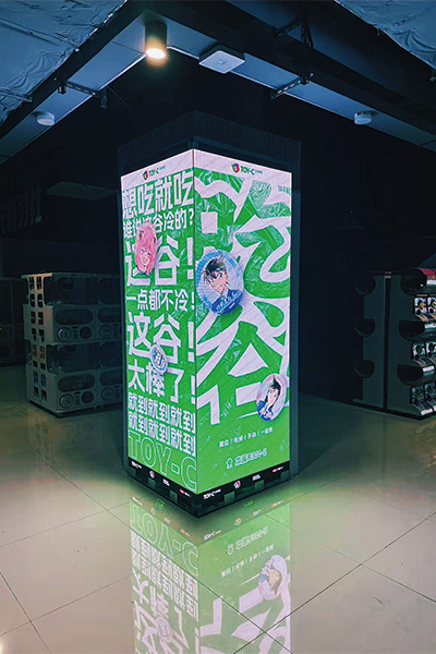 The corner LED display seamlessly connects two LED flat screens, creating a perfect blend. Compared to the multi-dimensional stereoscopic display effects achieved by conventional flat screens, it offers a wider, all-around coverage of the passing crowd, effectively reducing space waste while expanding the audience reach.