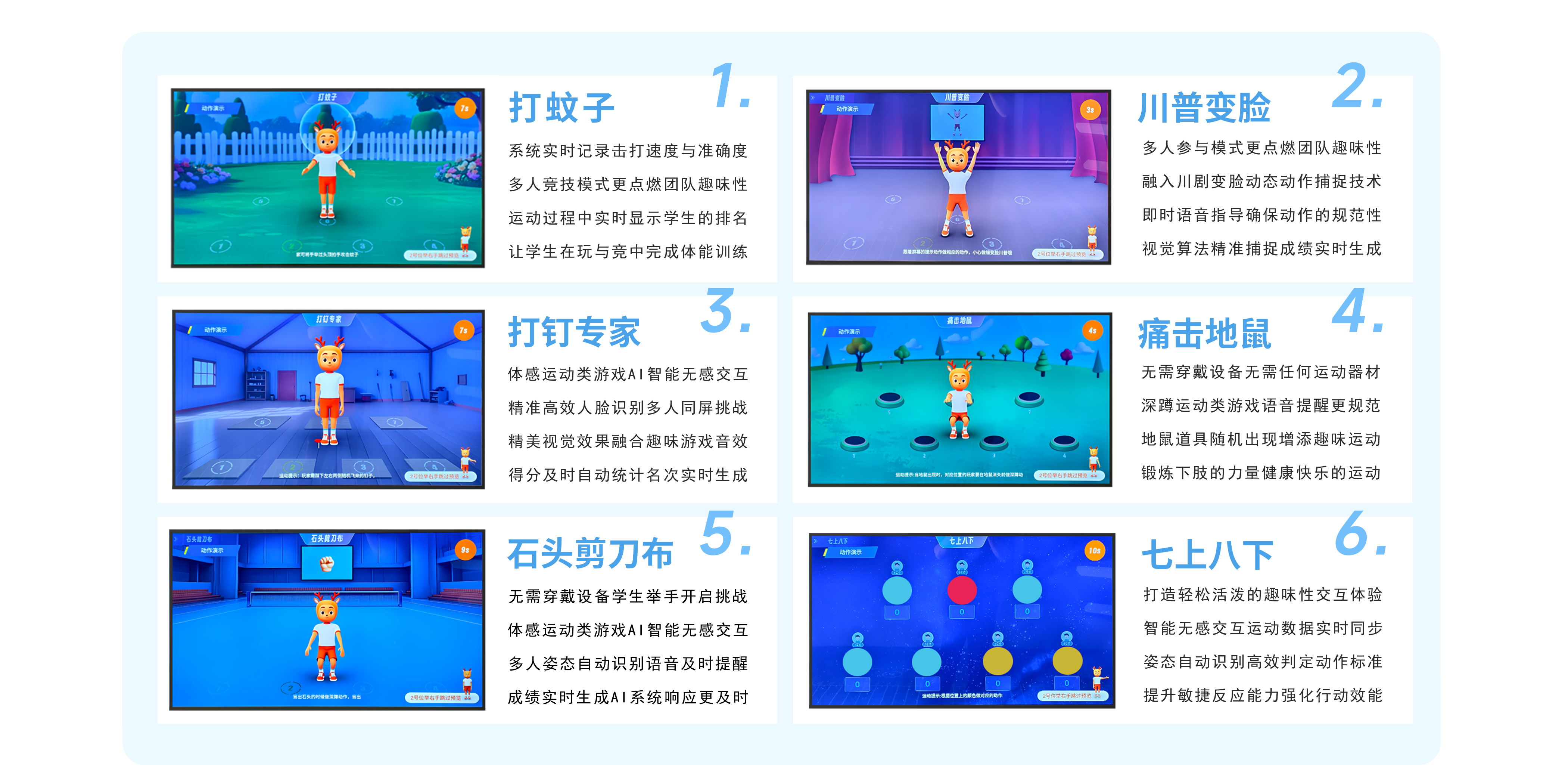 Product interface with cartoon characters, engaging sound effects, and smooth human-computer interaction, covering a variety of physical exercises and diverse fun activities.