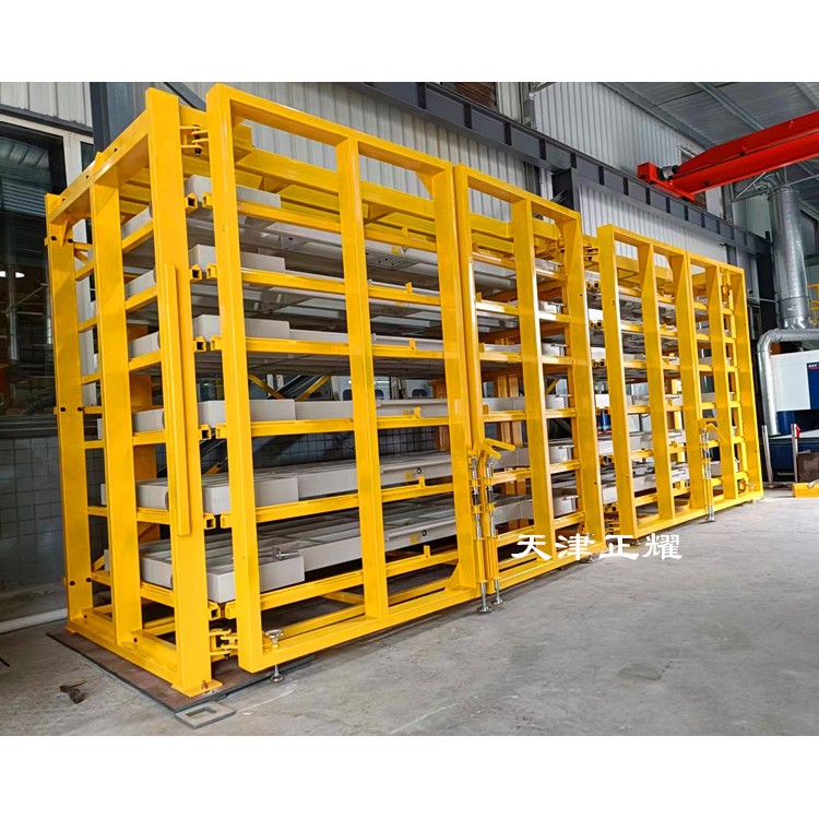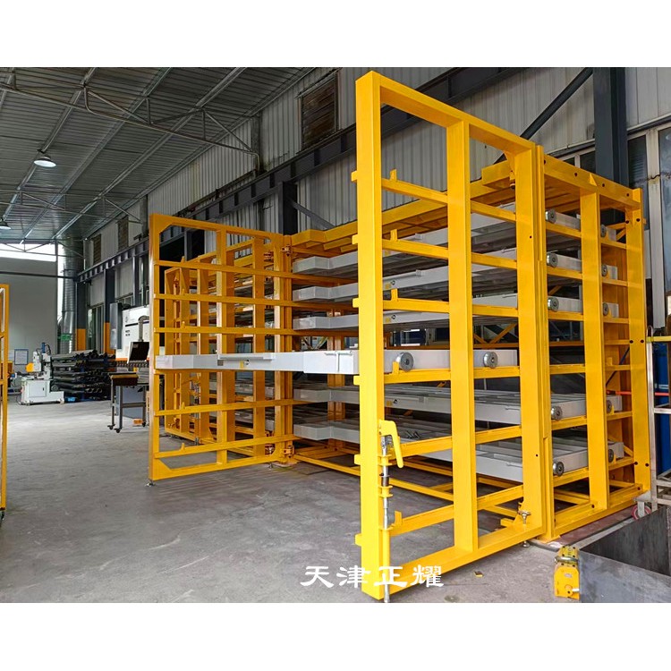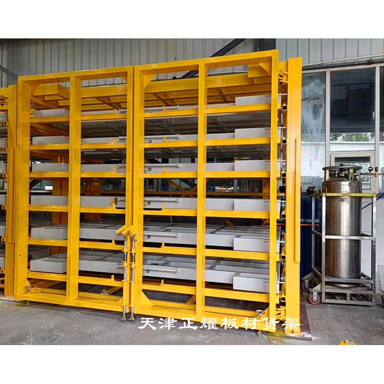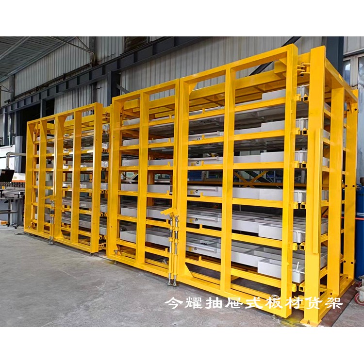 抽屉式板材货架的操作也便捷。当需要取出板材时,只需将对应的抽屉拉出或摇出,然后使用吊车吸盘或其他吊装设备将板材吊装到使用地点或激光切割机上完成切割工作。剩余的板材可以继续存放在货架上,方便下次使用。这种设计不仅减少了板材的挪动次数和损伤风险,还提高了工作效率和板材的利用率。