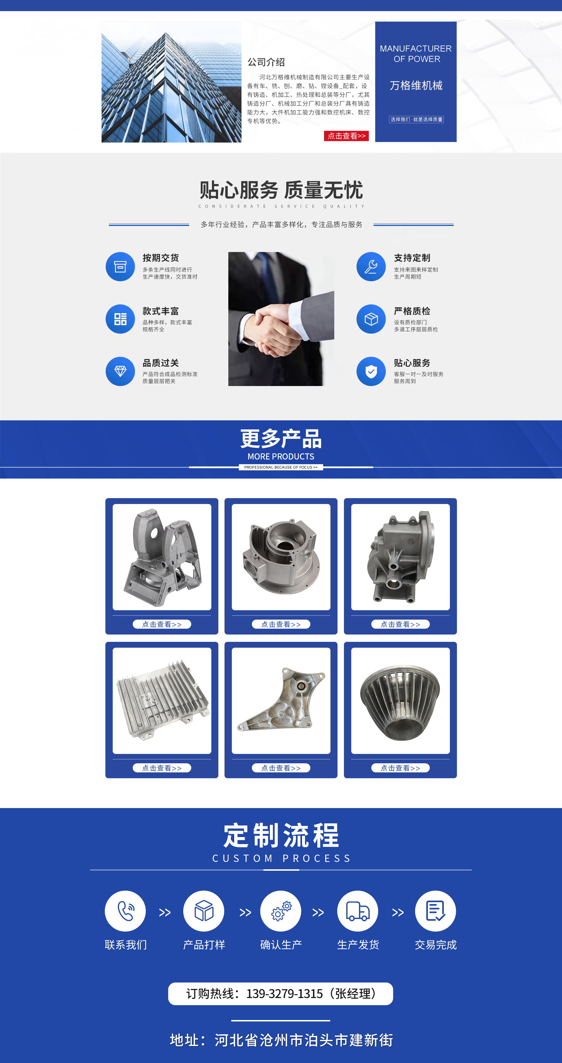 Hebei Wanggewei Machinery Manufacturing Co., Ltd. is conveniently located with easy access to transportation. Our main production equipment includes lathe, milling, planing, grinding, drilling, and boring machines, all with complete sets. We have separate factories for casting, machine processing, heat treatment, and final assembly, particularly the casting factory, machine processing factory, and final assembly factory, which boast large casting capabilities, strong processing capabilities for large-sized parts, and advantages in numerical control machine tools and special machines.The casting workshop is equipped with two 20T and 40T cranes, one 10T and one 7T cupola furnace, two 10x4x3m (length x width x height) drying kilns, one 10x4x5m (length x width x height) annealing kiln, one vibration aging machine, a fully standardized and comprehensive理化 laboratory and material testing equipment, as well as rapid on-site testing equipment and methods. The large furnace sec...
